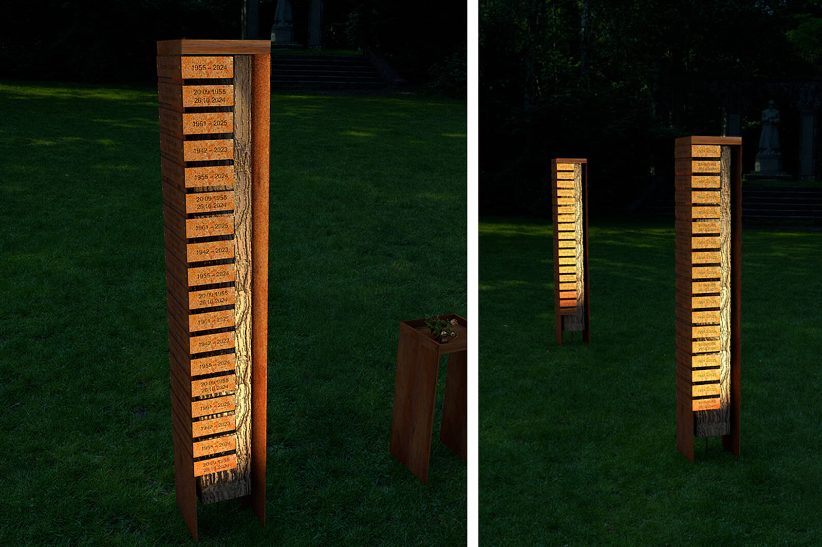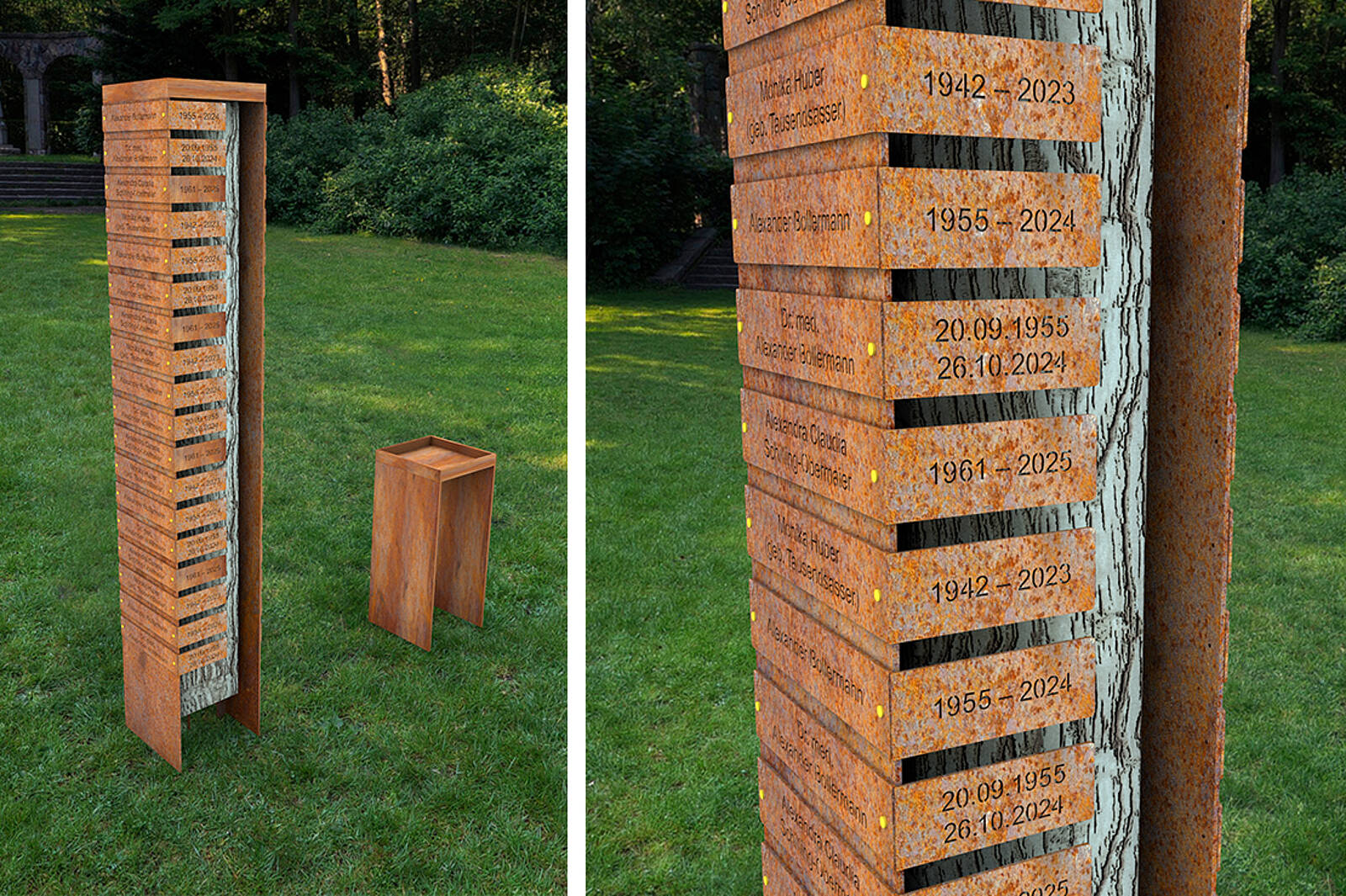 Der 220 cm hohe Turm besteht aus Cortenstahl und bietet Platz für 36 Namen mit Daten. In der Mitte beeindruckt ein großer 200–400 Jahre alter Eichenbalken, der Wärme und Natürlichkeit ausstrahlt. Auf Wunsch kann dieser auch als Insektenhotel genutzt werden.